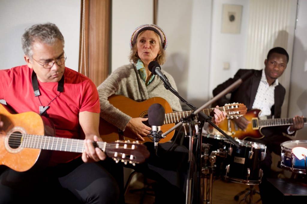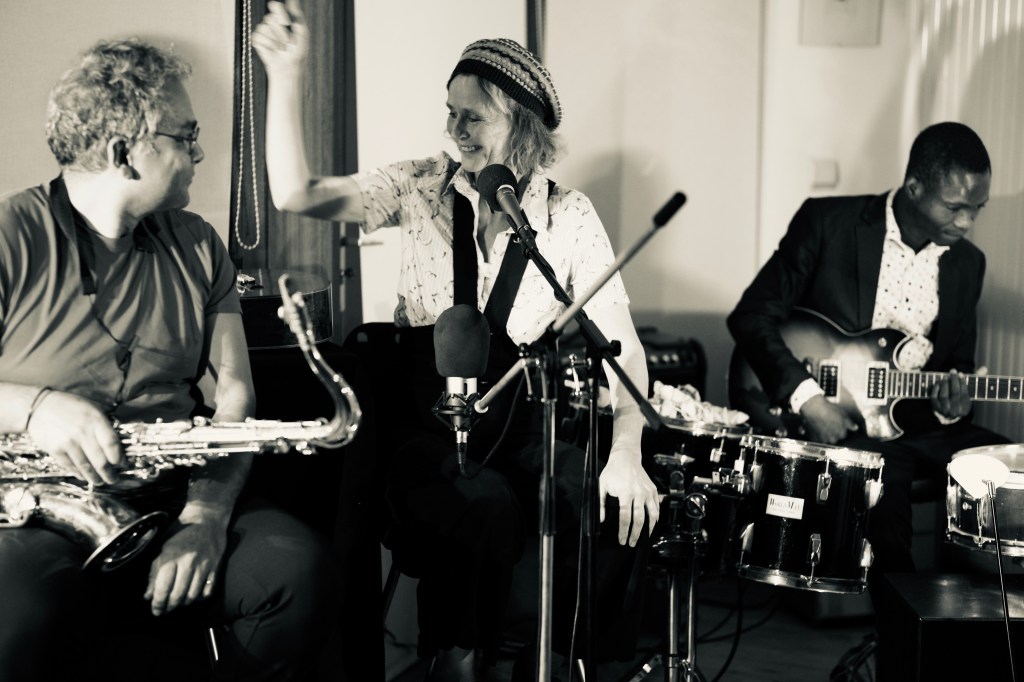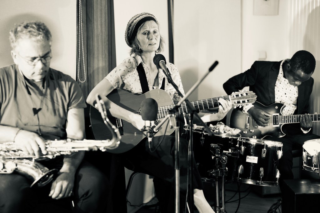 Mu (comédienne, metteuse en scène et auteure belge) ,Angelo Moustapha, le magnifique et sensible batteur béninois, multi instrumentiste, signe les arrangements des chansons de Mu autour de ce projet et d’autres projets musicaux et théâtraux qu’ils concoctent ensemble. Il accompagnera Mu à la guitare, au ukulele et aux percussions pendant les concerts.